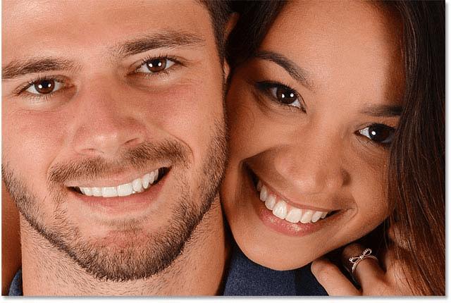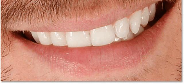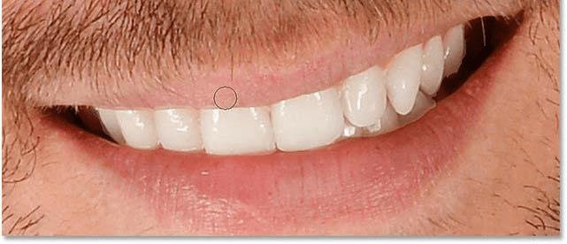 在这里,我沿着牙齿上方的上唇和牙龈线画。由于我们在图层蒙版上绘画,而不是图像本身,因此我们在绘画时看不到画笔的颜色。相反,色相/饱和度调整层的增白效果会从我们绘制的区域中隐藏起来: