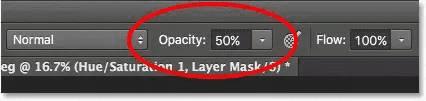 为了解决这个问题,我将通过画笔调整这些特定的牙齿,来减少色调/饱和度调整层的影响,您可以在屏幕顶部的选项栏中找到画笔的不透明度选项。默认情况下,不透明度设置为100%。这里会把透明度降到50%: