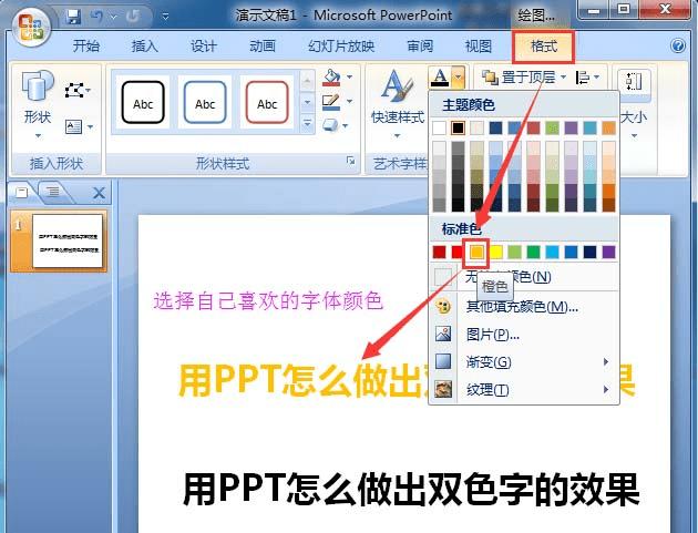 2、选中第一个文字,当然这个不是固定,选任意一个都是可以的,给文字填充上一个橙色。
