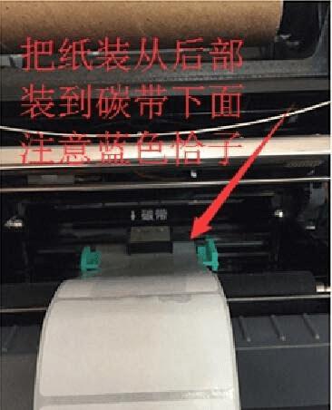 5、将条码纸安装好,正面朝上。热敏纸顺着上边讲过的地方通过,并将打印纸卡好。打印纸要伸出到机器外部