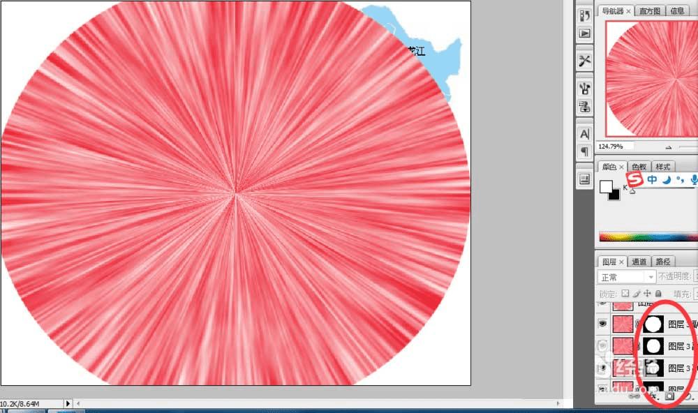 6、按住shift键,在图层3上画出正圆,移动正圆选区在中央位置,添加图层蒙版。重复操作图层3的副本,正圆选区逐渐增大。然后将红星图层移到最上面,并调整到中央位置。