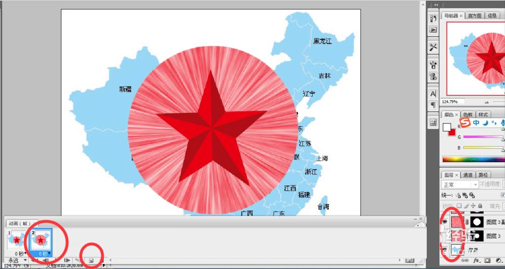 听了歌声《红星闪闪》,让我想设计一个“红星闪闪照中国”GIF动态图。让红星的光芒覆盖中国地图,且光芒有放大和缩小的变化。操作核心是要会做放射状光线图层,动态图,web格式存储。