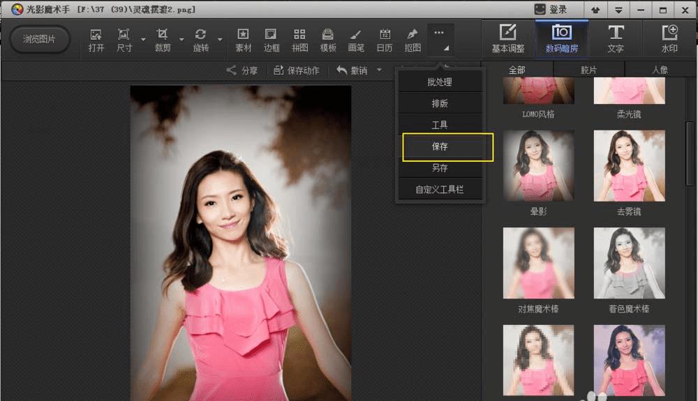 8、当然里面还有很多效果,我们可以自由组合和叠加,照片美化完成后,我们点击工具栏的小三角的保存即可。