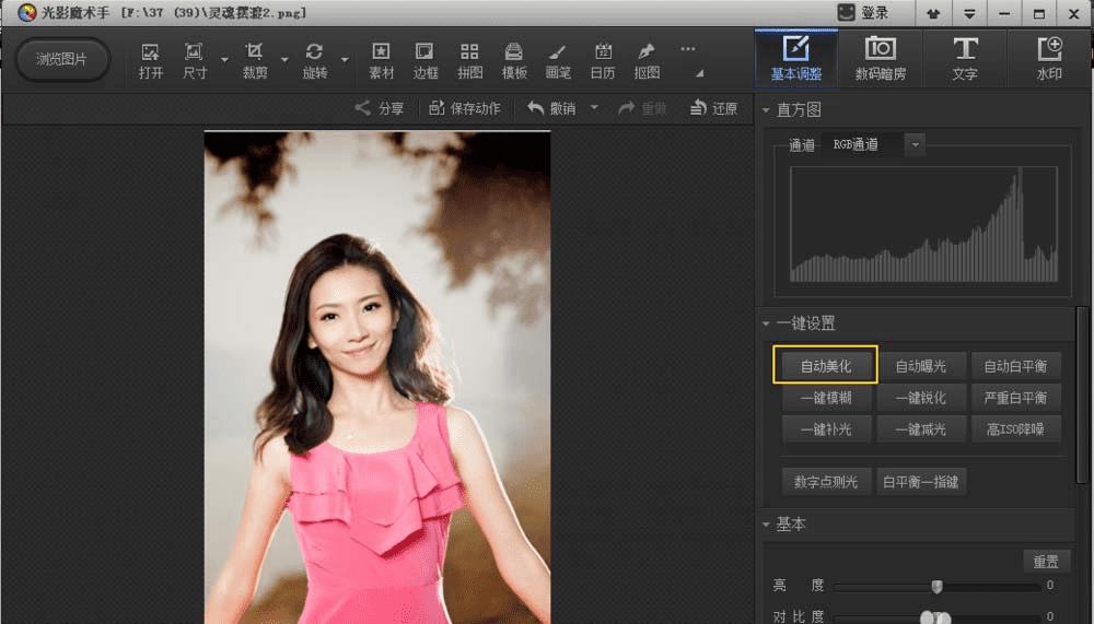 4、右侧的窗格中,我们可以基本调整下面的一键设置为我们提供了简单有效的操作。我们可以点击自动美化来美化图片。