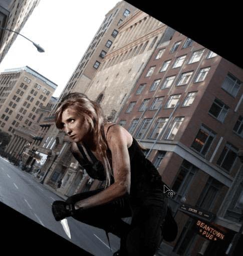 接下来将我们准备好的建筑素材拖入到我们的文档中。放置于女模特图层下。ctrl+T调整好大小并旋转一定角度。