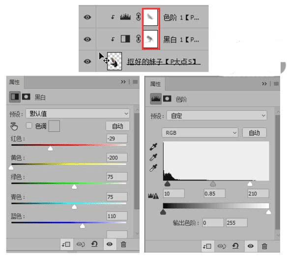 接下来在女模特图层上建立黑白调整层和色阶调整层,对模特进行轻微调整使得画面更暗一点。