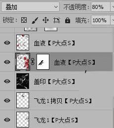 做完这一步后,ctrl+shift+alt+E盖印可见图层。在盖印图层上方新建空白图层,找到我们下载好的血溅笔刷,前景色设置为#a60000,在人物身体上和刀刃上适当涂抹,这个就自己随意发挥了,你觉得看起来可以就行。涂抹完毕之后,将该涂抹层混合模式设置为叠加,不透明度80%。这里如果对涂抹效果不满意,也可以自己通过蒙版等方式去调整。