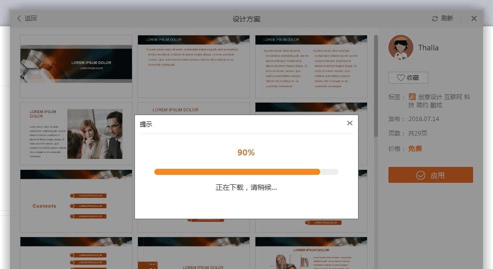 3、点击其中一个模板即可预览整套模板,如果喜欢此模板可先点爱心符号“收藏”,再点击“应用”,弹出下载提示框,下载完成后,模板直接插入到当前的页面中。