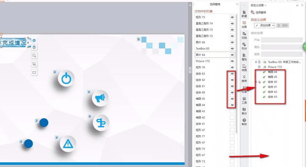 6、如图,俩操作框中的对象相对应。当隐藏某一对象时,最终幻灯片放映也不会显示该对象