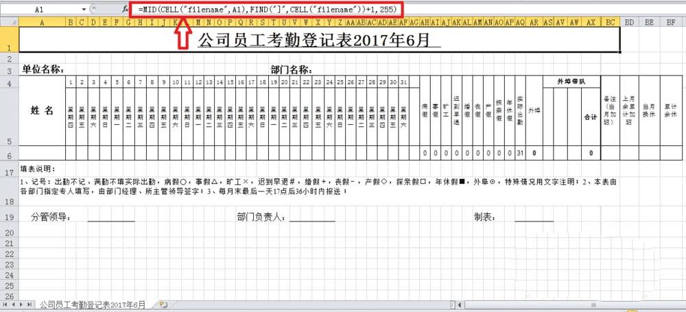 2、其次来看具体表示,1、公式=Cell("filename",A1)。取得A1单元格对应工作表名称(带路径),比如文件为:D:\我的文档\员工考勤表.xls,工作表为:公司员工考勤登记表2017年6月 。
