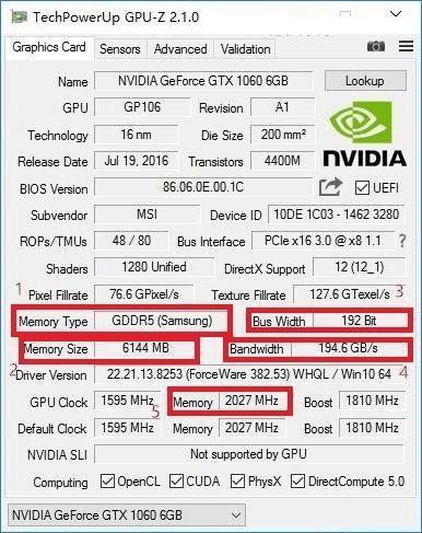 1号红框标注的是显存类型,从图中可以看出GTX 1060使用的显存类型为GDDR5,显存颗粒生产厂商是三星;