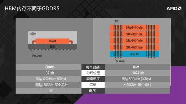 我们可以将GDDR5和GDDR5X划为一类显存,HBM和HBM2划为一类显存,然后我们主要对比一下GDDR5和HBM:GDDR5内部I/O位宽是32-bit,目前常见的GDDR5显存频率可以达到1750-2000MHz,由于其为4倍速率机制,所以等效频率是7000-8000MHz;HBM显存的频率很低,只有500MHz,采用2倍数率机制,等效频率是1000MHz,不过它的内部I/O位宽高达1024-bit,因而弥补了频率低的不足。