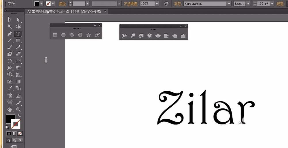 1、.新建一A4横向文档。默认 参数即可。输入文字。选择文字工具 。 输入文字。z大写ilar小写选择字体为Harrington;大小自定。合适就行。