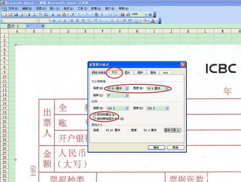 3、打开一个excel文件,点击“插入”——“图片”——“来自文件”,将刚才裁剪好的图片插入excel。用尺子量好凭证的长和宽。在图片上右击,选择“设置图片格式”,弹出的对话框选择“大小”,将量取的凭证的长和宽填入。锁定纵横比这个选项可以根据实际量取的尺寸自己选择。