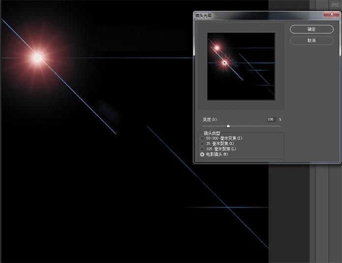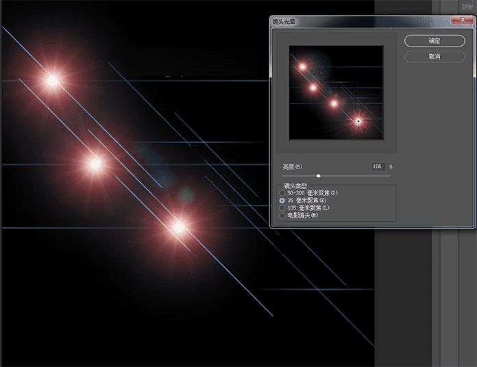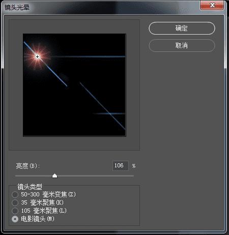 6、再执行‘滤镜-渲染-镜头光晕’,选35毫米聚焦,用鼠标将光源点放再在下面一点。