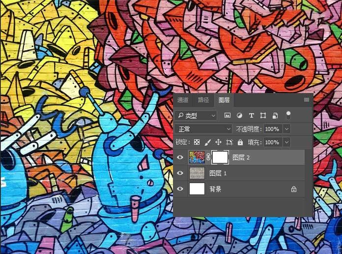 3、单击“ 图层”面板底部的第二个图标,将“ 图层 蒙版”添加到“ 涂鸦墙”图层。