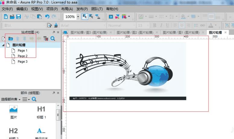 6、三个图片均设置完成后,点击左侧上方的“图片轮播“页面,返回主页面,这里我们可以看到之前的动态面板已经默认显示图1的图片了。