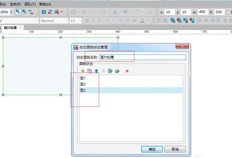 2、双击建立的动态面板,弹出“动态面板状态管理”窗口。给当前动态面板起名字为“图片轮播”;在面板状态区域,点击“+”增加状态,需要有几个图片轮播,建立几个状态,在每个状态上,右键,可重命名,当前我们做三个图片轮播的,命名为“图1”“图2“”图3“。完成后,点击窗口的确定按钮。