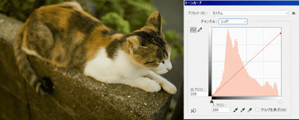 这张照片偏于红色,所以选择红色通道,将右上角的点向下移动,这样就去除了偏色的红色。