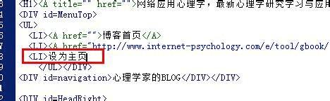 7、找到<LI><a href="#">设为主页</a>这段代码,然后在href=“#"后面添加onclick="this.style.behavior='url(#default#homepage)';this.sethomepage('http://www.baidu.com')"代码。这段代码你看到这段代码,你需要修改其中的网址为你的网站的首页网址