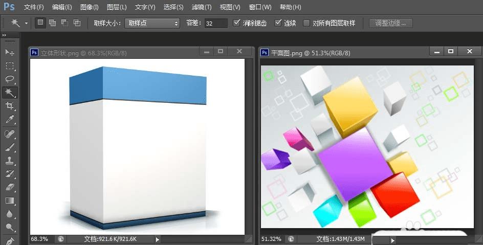 1、首先利用PS打开一张平面图片和一张立体图形,此时的效果如图所示:通常我们将平面图片贴到立体图形的表面。