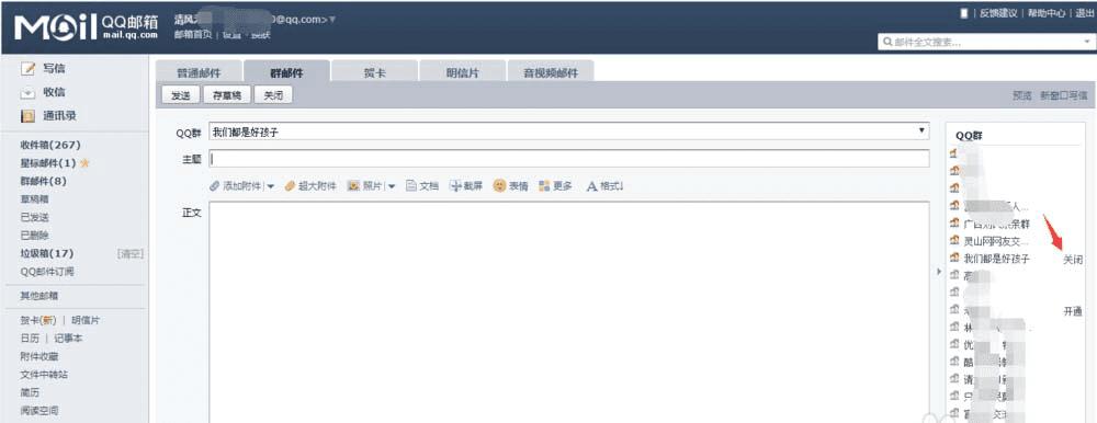 2、然后我们在右侧可看见QQ群列表,看到想要关闭群邮件的群名后面有个“关闭”标志。