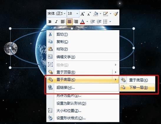 4、调整轨道、月球的层次位置:如图,选择轨道,点击右键,在下拉菜单中——》置于底层——》下移一层即可。如图所示,月球在轨道上的效果。