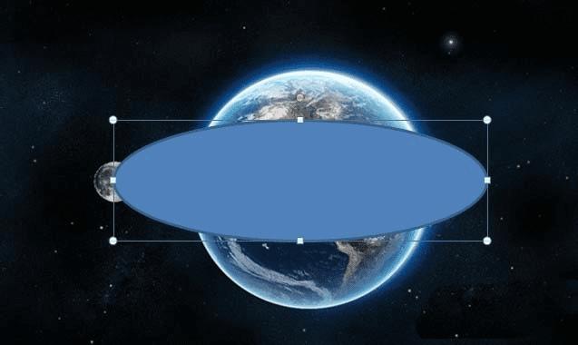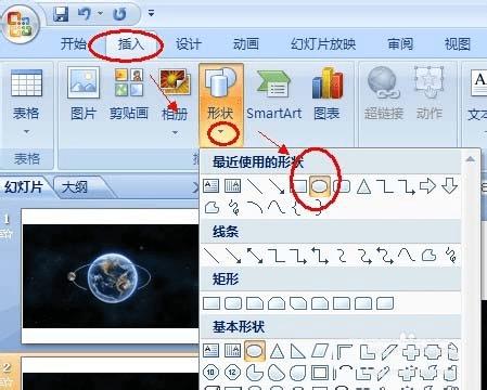 2、画轨道:如图所示,在ppt选项卡中选择插入——》形状——》选择椭圆,然后在图中画出椭圆,并拉动位置和大小,正好如图所示。