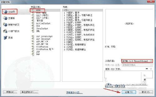 在新建文档窗口,选择“空白页”—“HTML”,文档类型选择“XHTML1.0 transitional”,单击“创建”按钮。