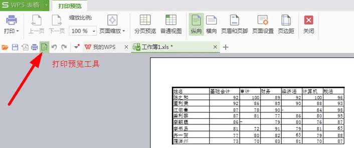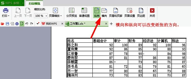 5、在打印预览的效果中可以看到有【纵向】【横向】的选择,一般打印机首先是纵向的标准A4纸张的效果,当表格比较宽的时候,可以选择【横向】纸张效果。