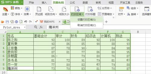 3、在工具栏上的【页面布局】里面的菜单中可以看到【打印区域】。选择“设置打印区域”,当设置打印区域的时候,需要先把自己需要打印的部分用鼠标选择,如图选中有数字的区域,然后再去工具栏上设置区域。