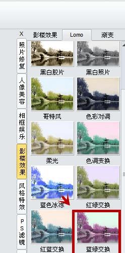 4、在LOMO下选择单击蓝绿交换特效。