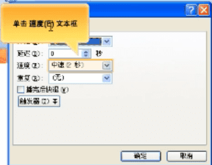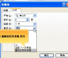 6、选择计时,打开计时窗口。单击速度文本框,将速度改为0.05秒。再单击重复下拉框,选择直到幻灯片末尾。