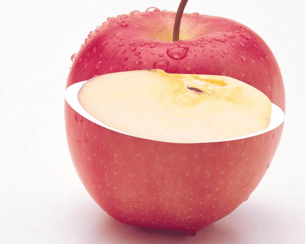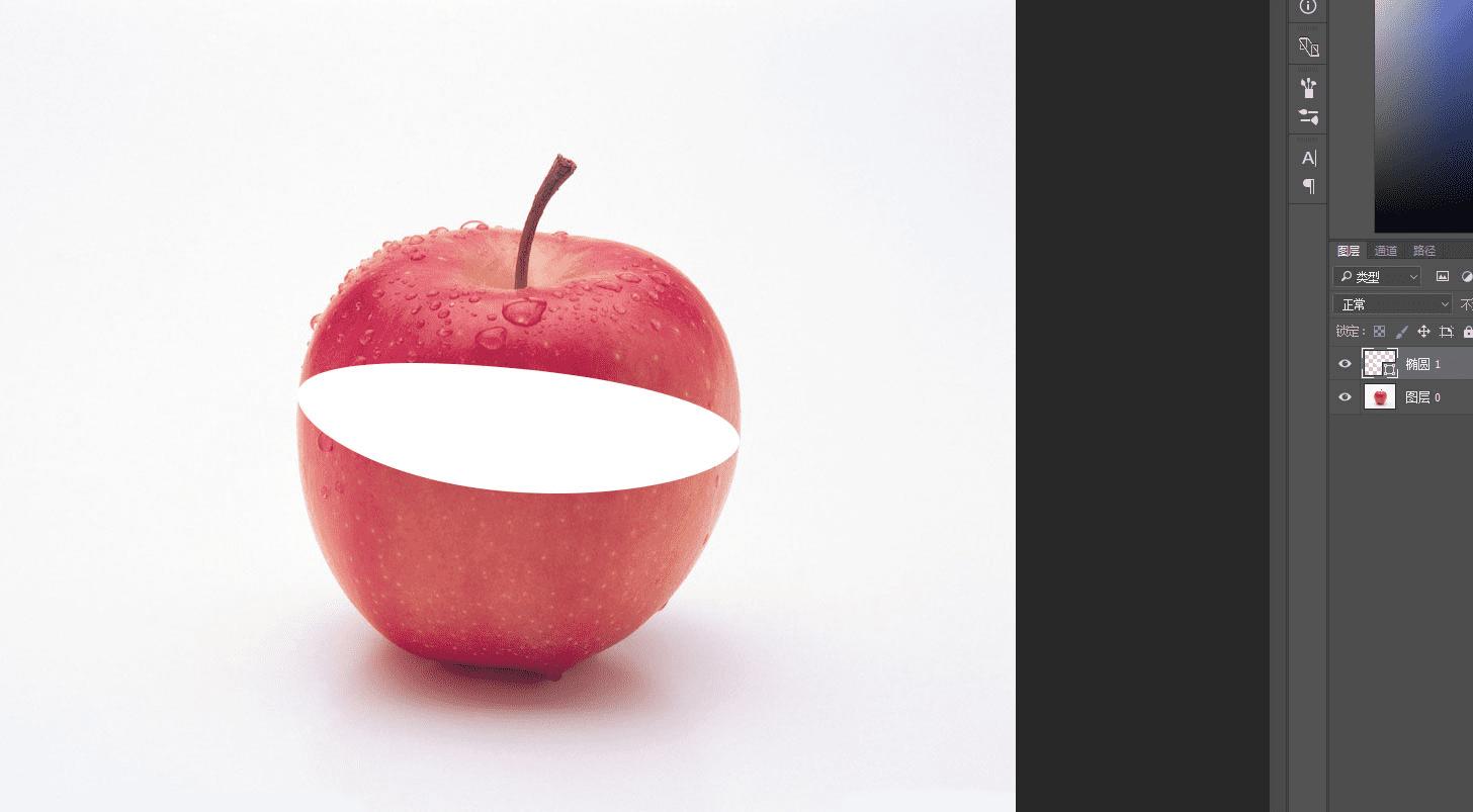 对苹果图层添加蒙版,擦去多余的部分,然后切开的苹果的型就有了;