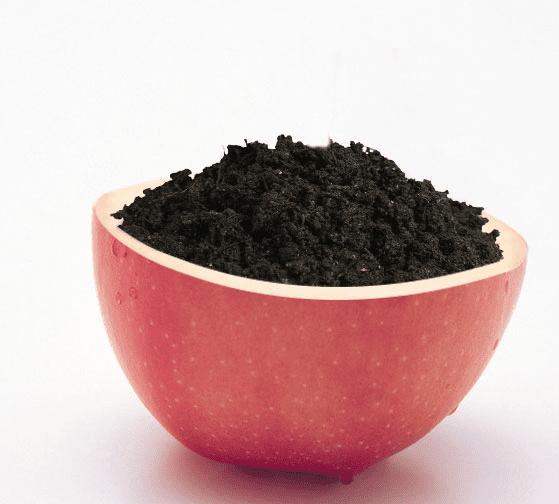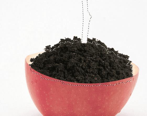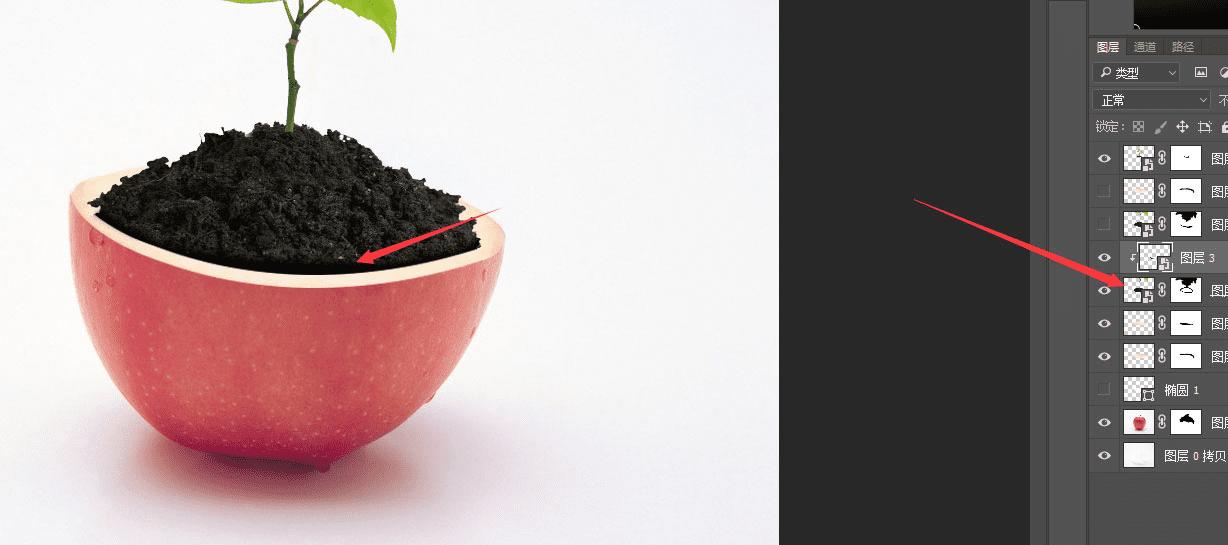 复制刚刚切片苹果图层,放到土壤上边,上移一些像素,创建选区,然后反选,切换到土壤蒙版,画笔涂掉这一部分土壤,然后取消选区,隐藏上面复制的这一层;