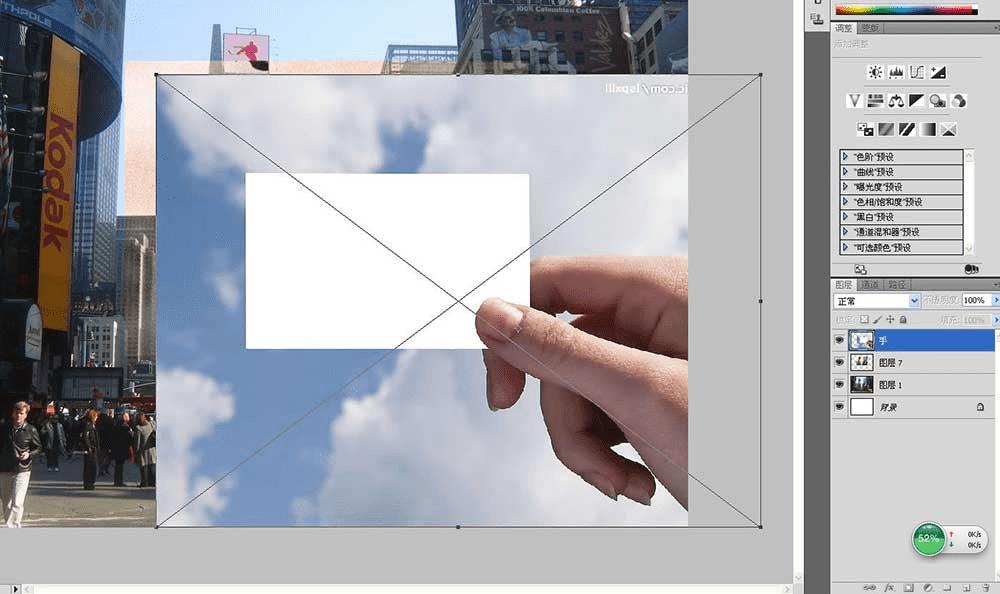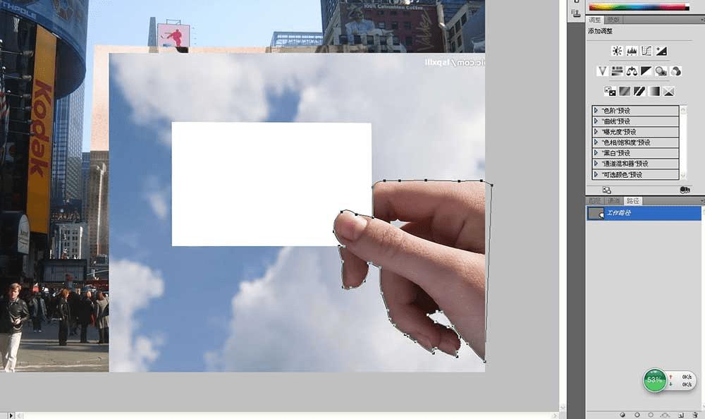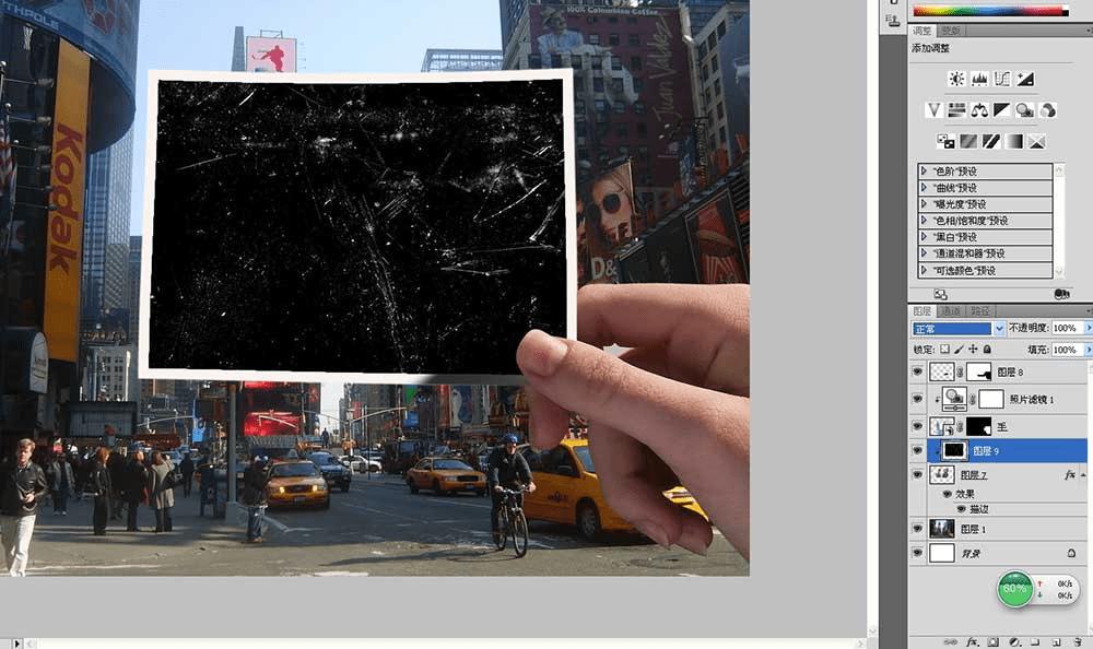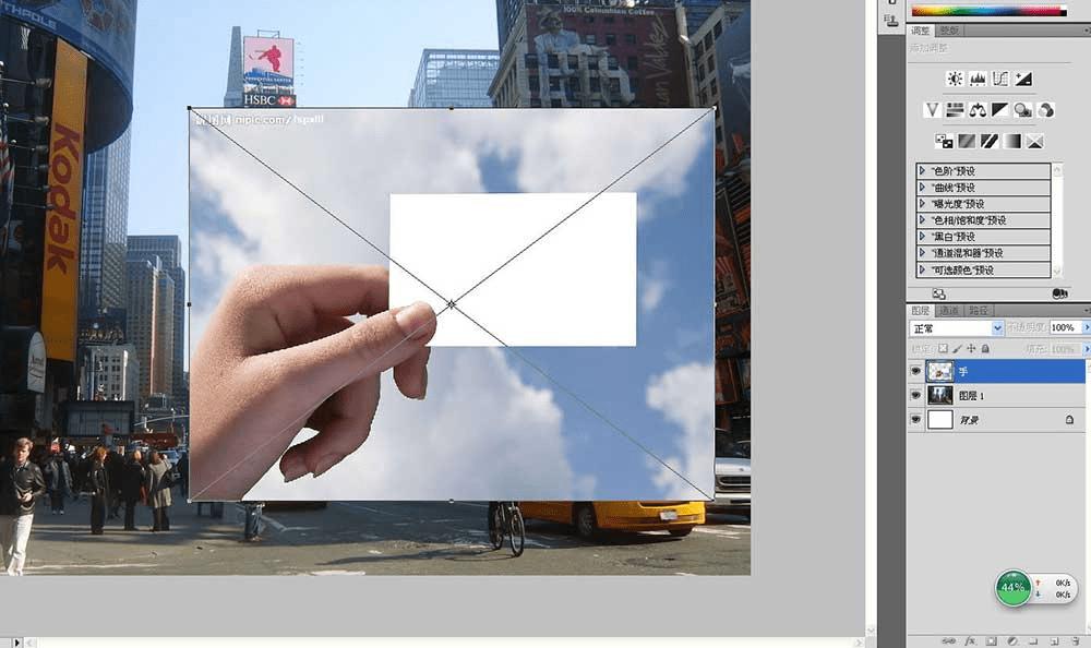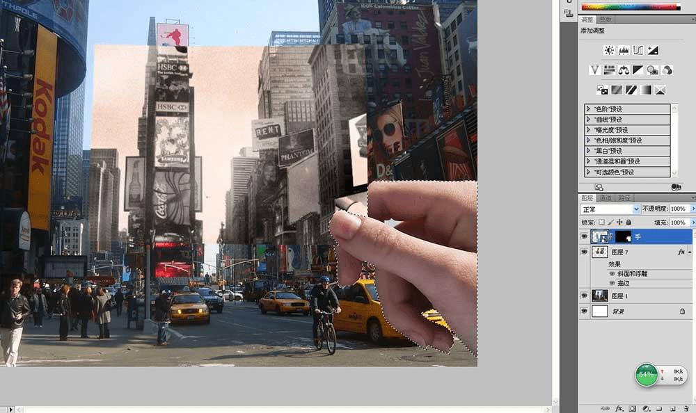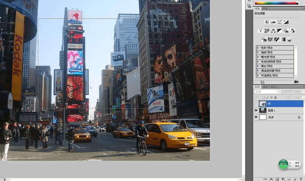 先把手隐藏,拉一个照片的选区。把时代广场ctrl+j一张出来~