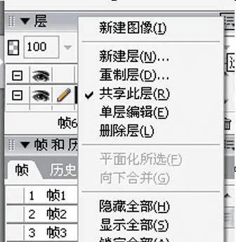 2、在层的面板的右上角有个图标点一下,然后选择“共享此层”