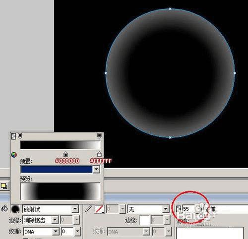 2、添加辐射渐变。像圆内添加渐变,渐变的方式选为“放射状”,颜色填充值为#000000 ->#FFFFFF。同时设置透明度为55%。