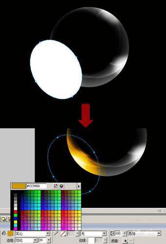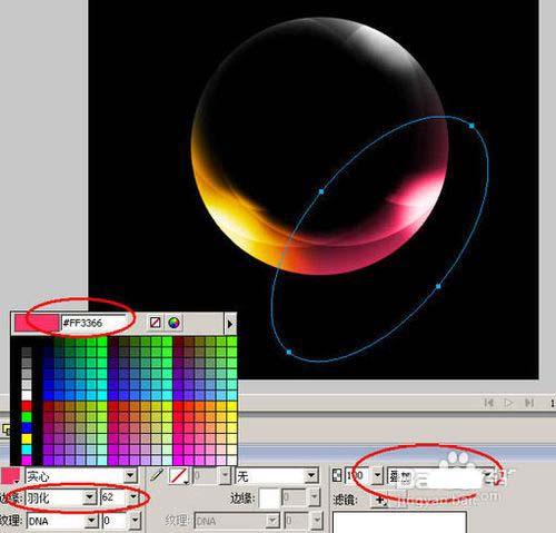 1、画一个圆。启动Fireworks-> 将背景调成“黑色”,在画布中画一个圆。