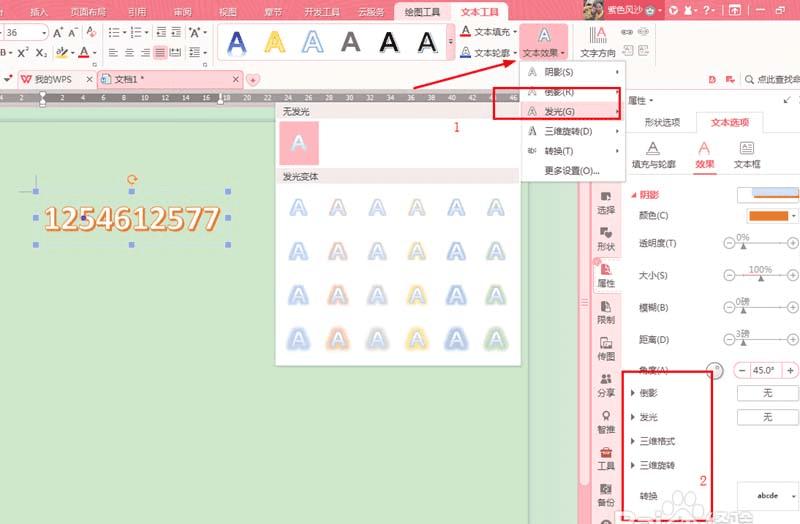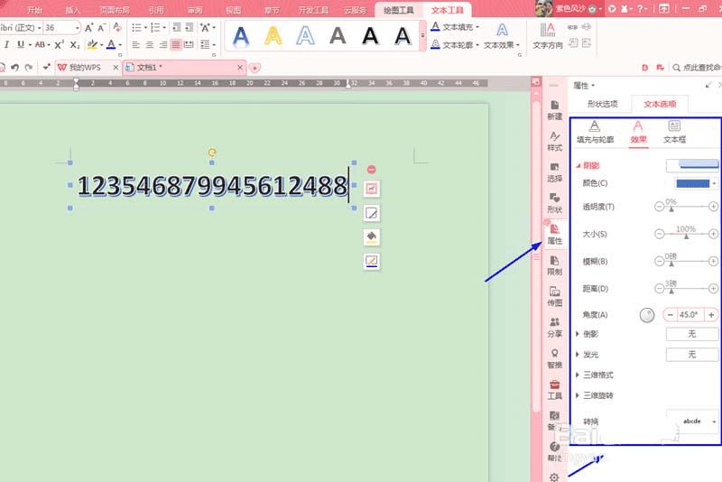 3、在艺术字中的更多设置中,点击确认之后,可以看到右边的【属性】,对文本效果的【阴影】颜色大小距离角度等设置。