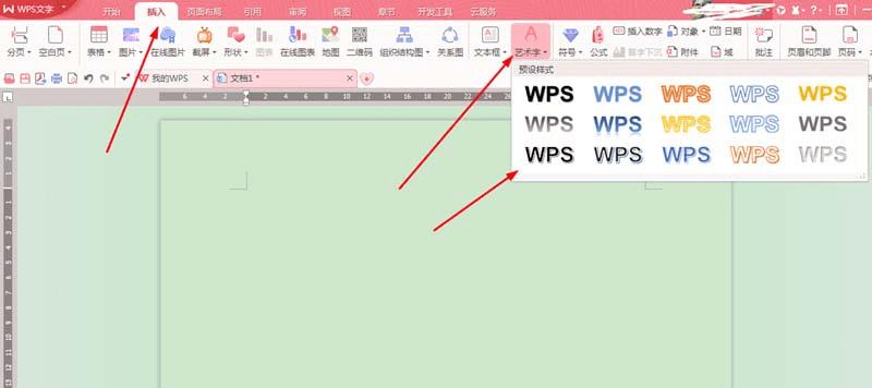 1、在新建的文档中,选择工具栏上的【插入】---------【艺术字】。点击进入。有很多艺术字的样式,先随意选择一个。