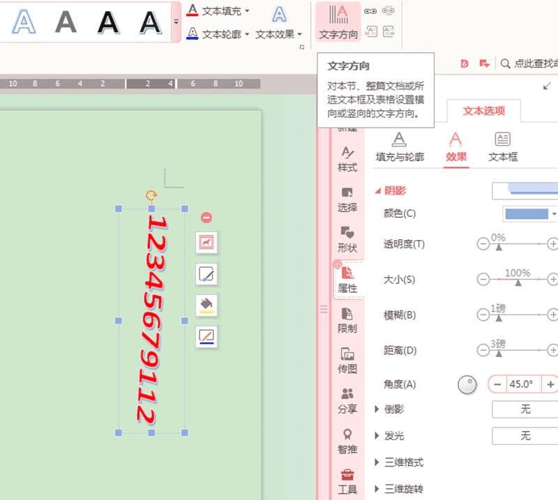 4、在艺术字的文字方向,这里可以改变字体是竖向还是横向。