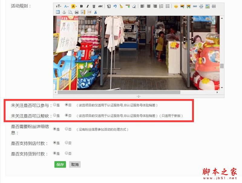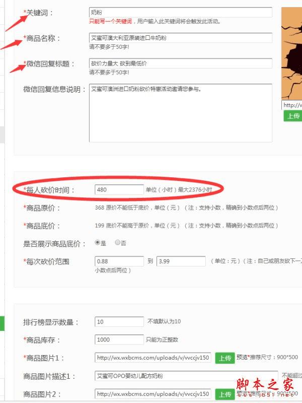 3.点击左侧的微信商城,找到“微砍价”功能。填写关键词、标题等内容,上'传回复图片,注意选择新版本,设置每人的砍价时间、原价、底价以及每次砍价的范围。奖项及设置规则详情,勾选需要关注才能参与,需要关注才能帮砍价,全部弄好以后点击保存