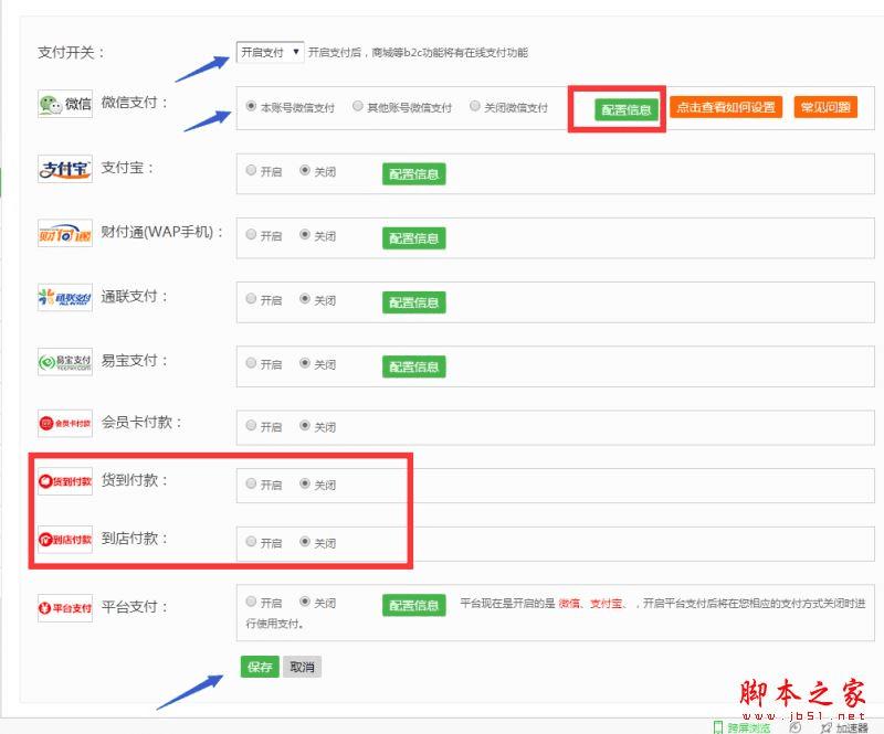 2.配置支付接口。点击左侧微信商城---在线支付设置。选择什么支付方式就填写对应的支付配置,【需要公众平台开通了微信支付】。然后下面位置货到付款和到店付款选择开启或者关闭状态。