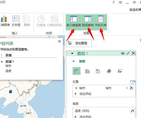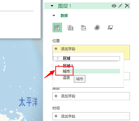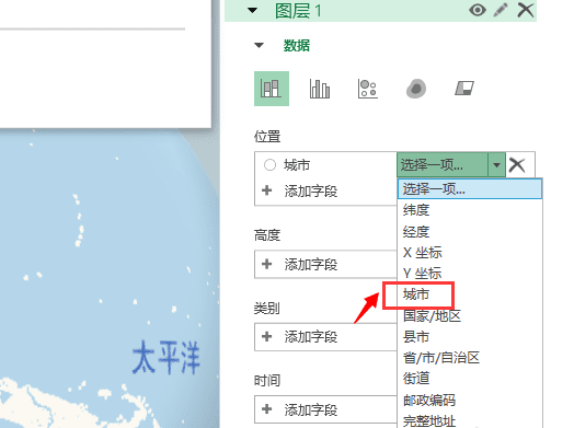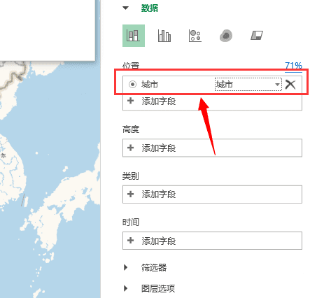 4、进入三维地图的图层窗格,在位置这个地方,点击开始添加字段,这个就是三维地图对应的城市位置。