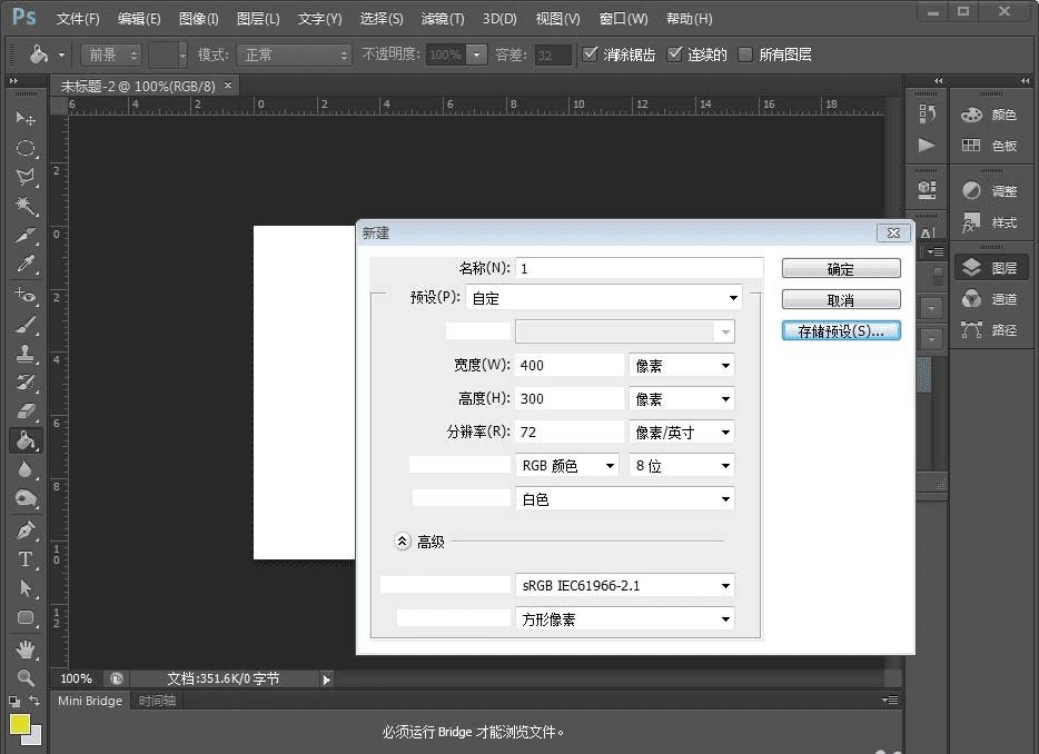 1、打开电脑,在打开软件。新建文件,大小为400x300.也可以根据所需大校
