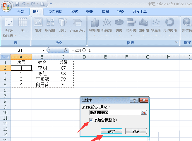 5、在弹出的窗口中,记得勾选表包含标题,然后点击确定。