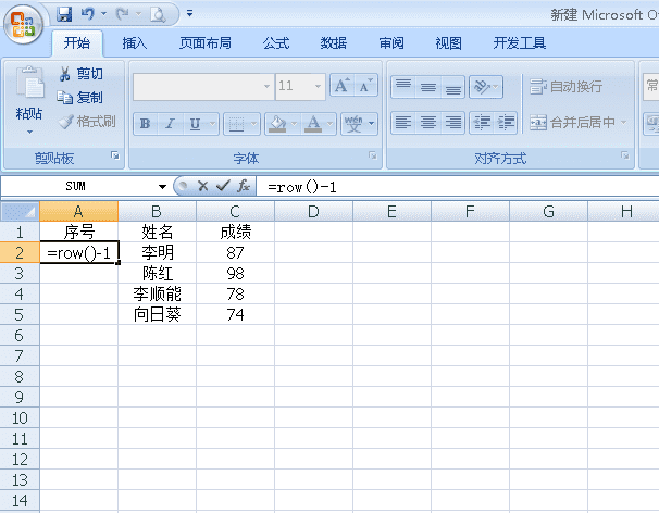 2、在第一行数据序号中 输入公式 row()-1 并按回车确认公式生效,会显示序号会显示1