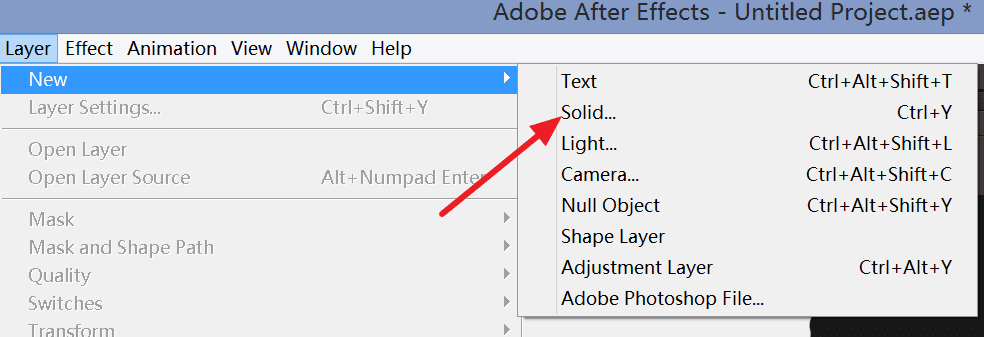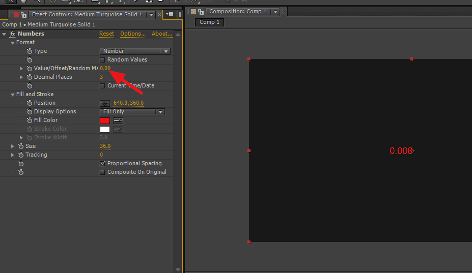 5、接着选择固态层,点击【F3】,打开特效窗口,即可看到刚才添加的number,箭头所指的就是数值的变化