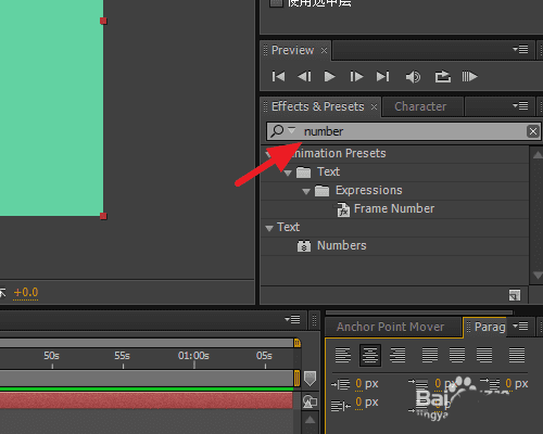 3、在【effects & presets】中查找【number】特效,添加到固态层上